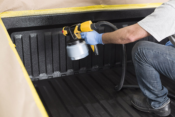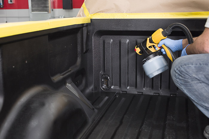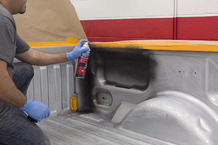For hard to reach areas, the convenient aerosol can spray upside down to hit the lip on the underside of the truck bed sidewall.