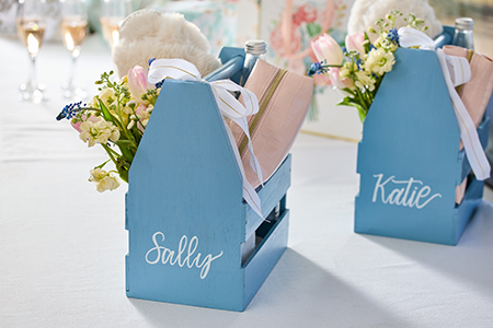 A few of Katdare’s favorite transformations include using Universal Aged Metallic Spray Paint in Vintage Gold to give wooden or metal easels a classic look. She also likes playing up something blue by turning champagne caddies into personalized bridesmaid gifts or adding unique and unexpected pops of color to floral centerpieces.