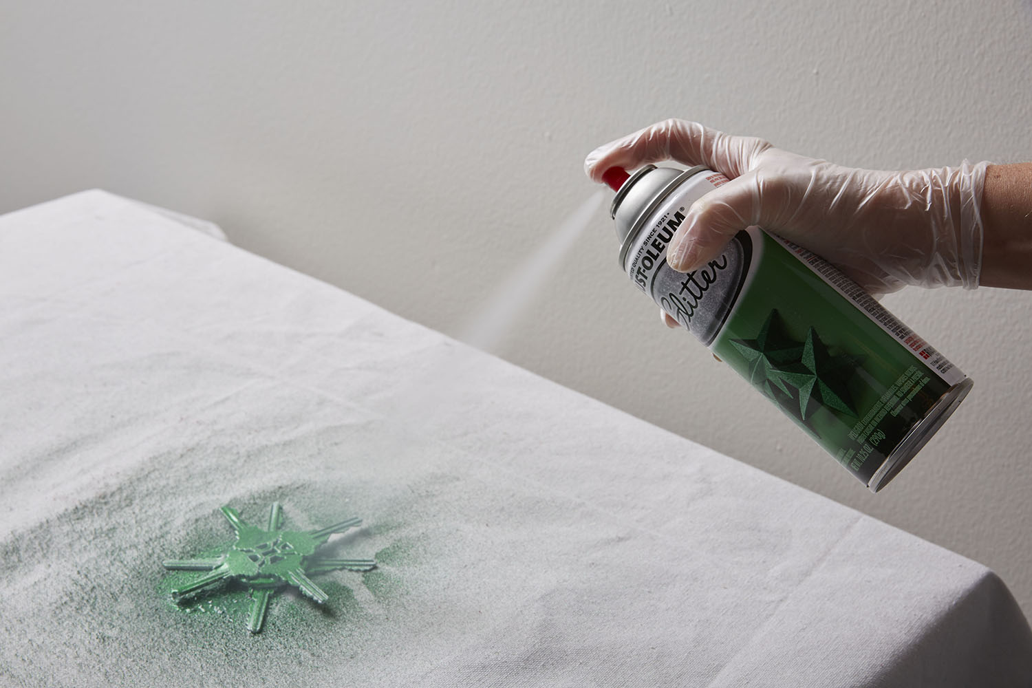 Don't throw those old keys away. Add a few coats of Rust-Oleum Glitter spray paint and glue them together to create a unique snowflake ornament that can hang just about anywhere.