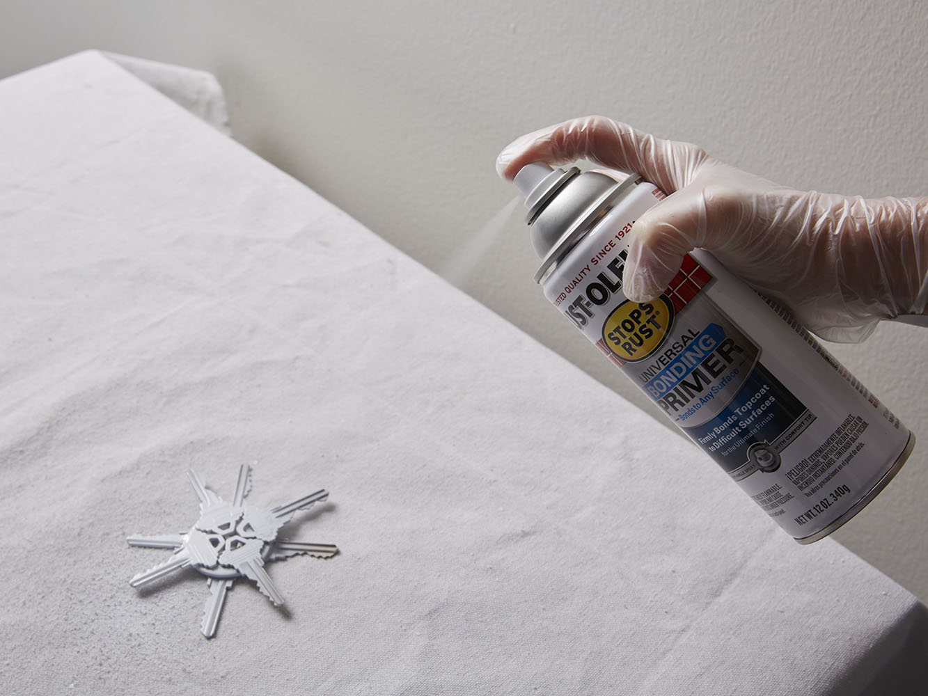 Spray Rust-Oleum® Stops Rust® Universal Bonding Primer on the keys, following the directions on the can. Spray 2 or more light coats for best results. Dries to the touch in 30 minutes and dries to handle in 1 hour.