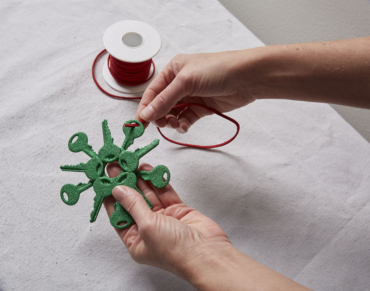 Once the sealer is dry, tie on a ribbon or fishing line to hang your key snowflake ornament on your Christmas tree, in a window or on a fireplace mantel.