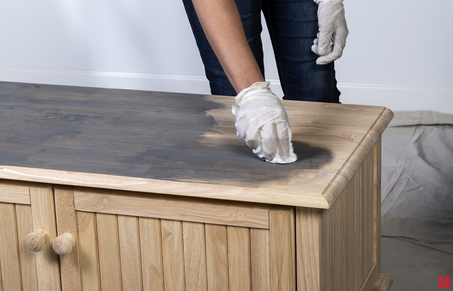 Make sure your blanket storage chest is on a drop cloth before you begin. With any unfinished piece, make sure the surface is smooth by lightly sanding any spots that feel rough and wipe away any sanding residue with a lint-free cloth.