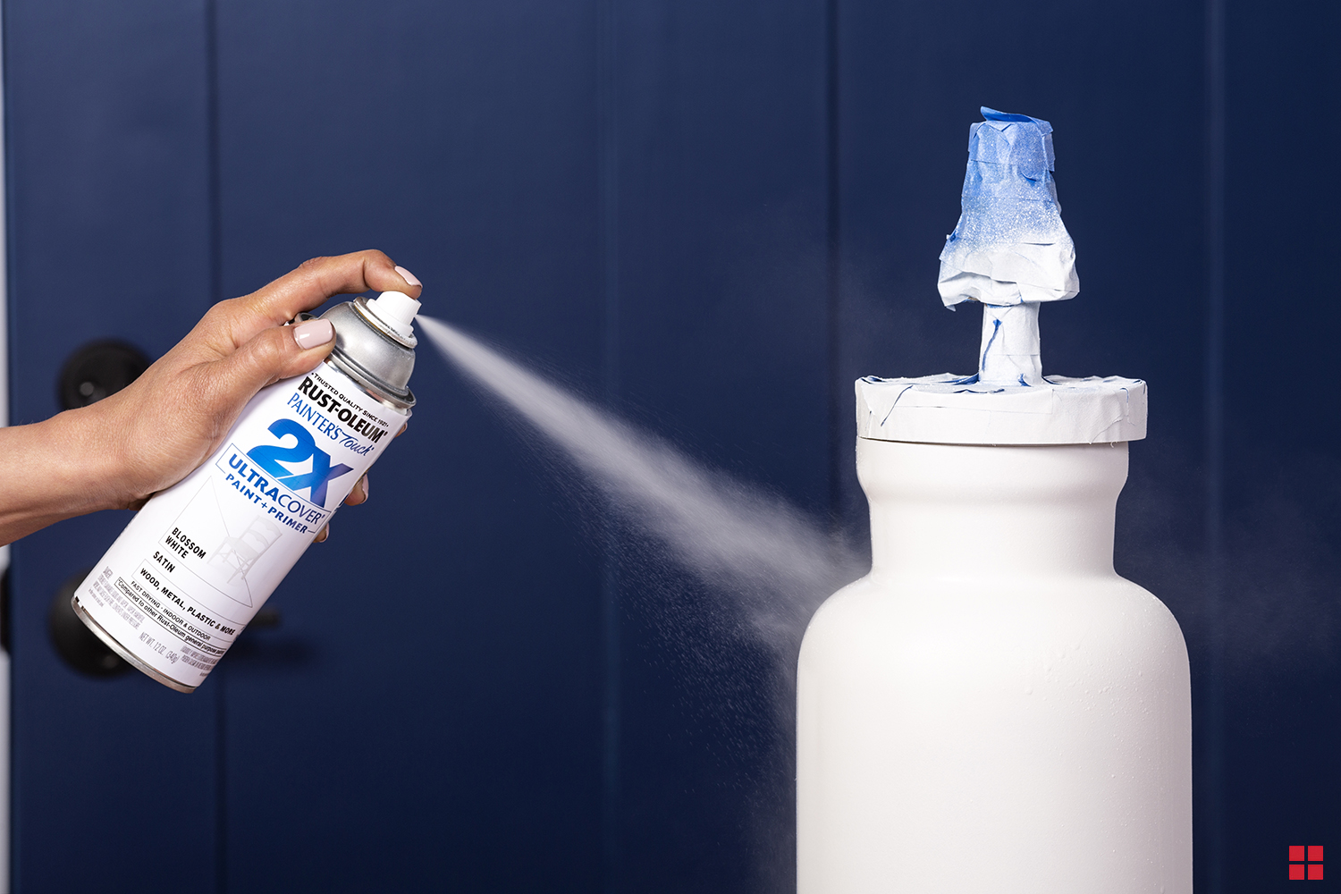 A coat of 2X Ultra Cover Primer in White provides a great base for your color and gives you a longer lasting finish. Spray on the primer according to the directions on the can. After 20 minutes, start spraying Blossom White spray paint over the primer in several light coats for best coverage. Let the first coat dry for at least 20 minutes before applying a second.