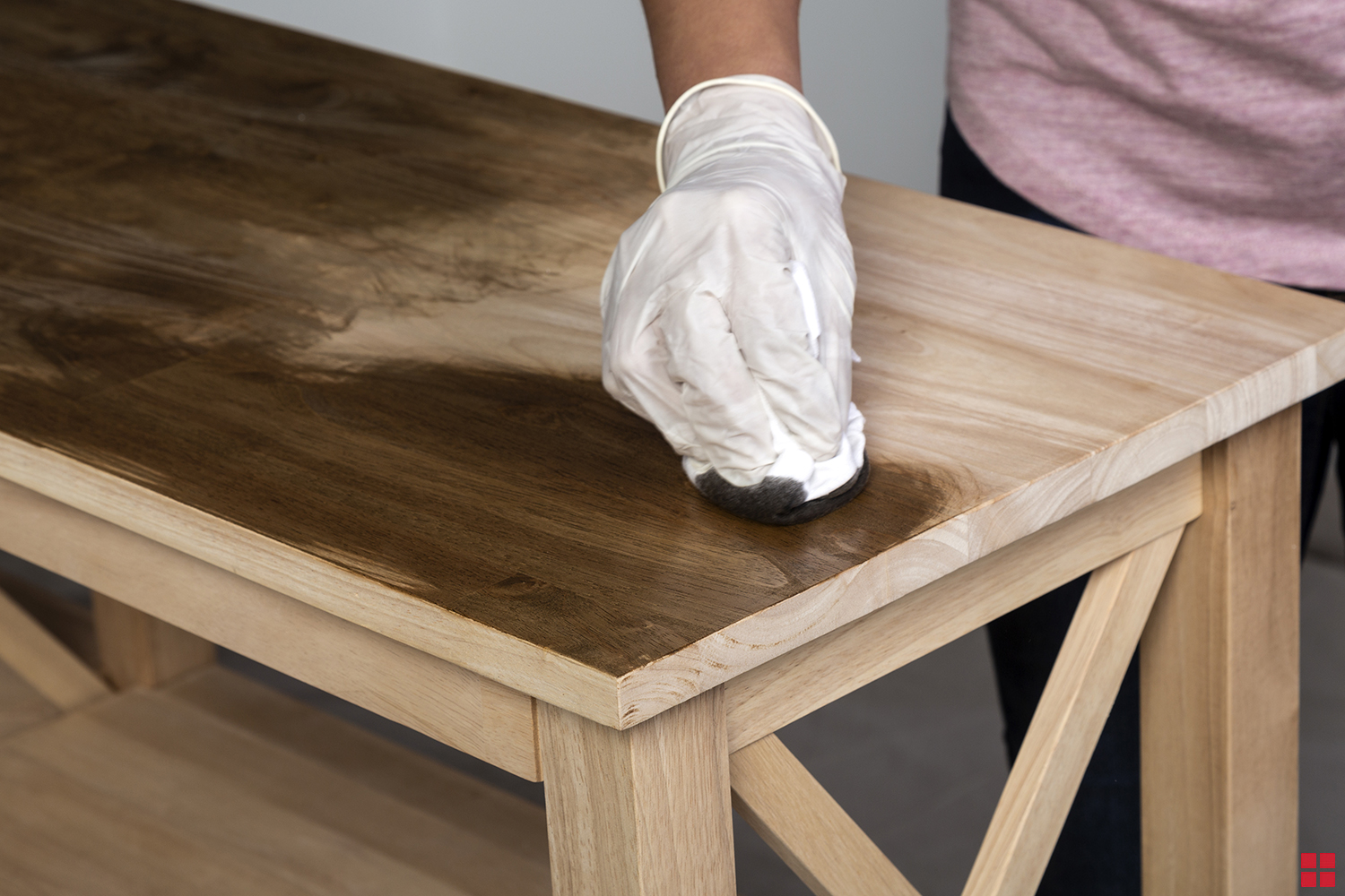 Once your surface is smooth, apply a generous amount of Varathane wood stain with a lint-free rag and work it into the wood in circular and back-and-forth motions going with the grain of your wood. Wipe away any excess stain with a clean, lint-free rag and let the stain dry for 1 hour.