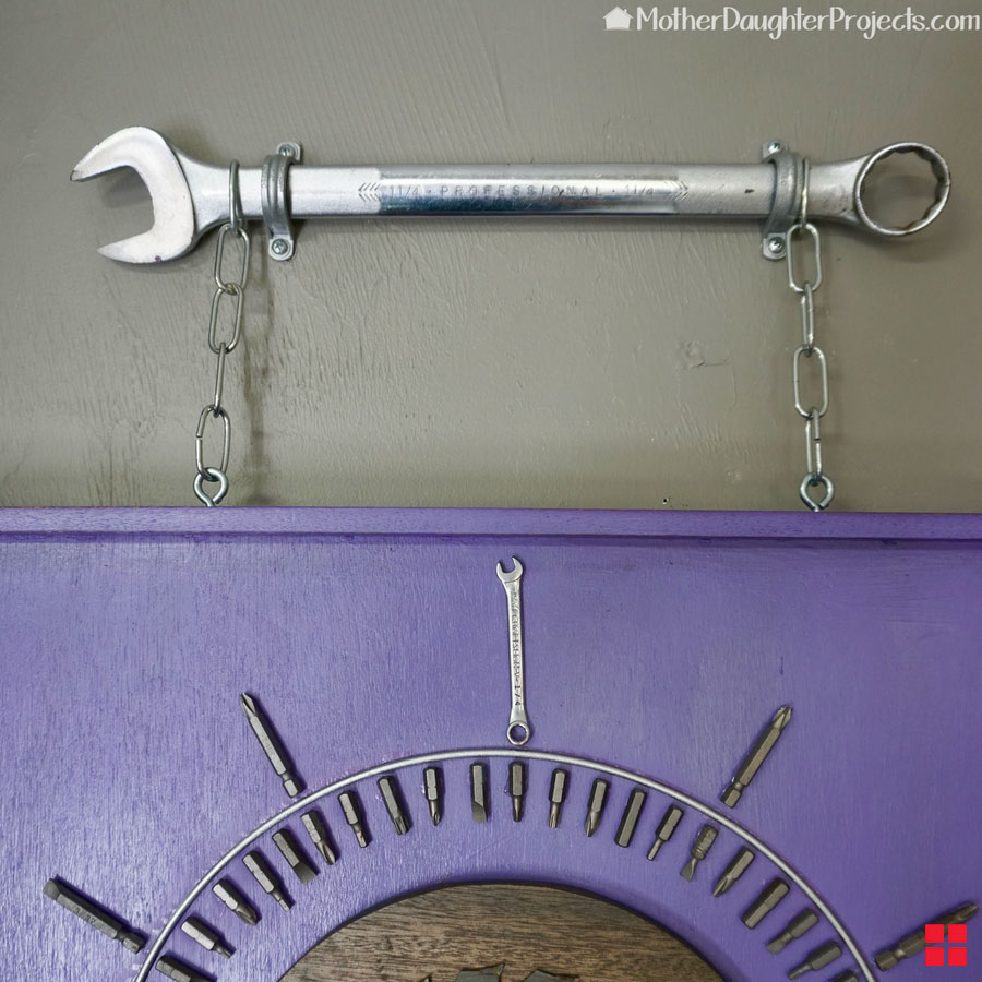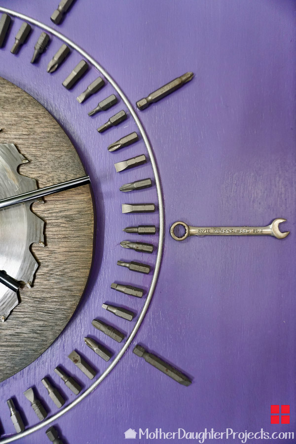 Rust-Oleum Ultimate Wood Stain and Universal Metallic spray paint in Titanium Silver put the finishing touches on this tool clock made from used and free items. A true trash-to-treasure piece, this clock would make a great gift.
