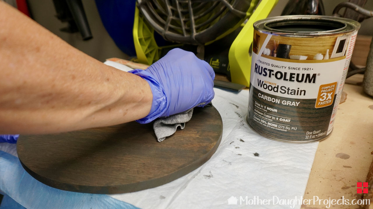 Step 3: Remove cork from wood trivet, then sand and stain the wood with Rust-Oleum Wood Stain, according to the directions on the can. Let the stain dry for approximately 1 hour.