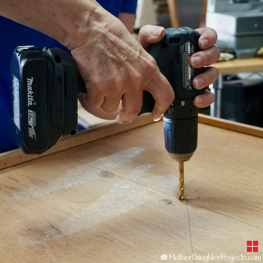 Step 4: Drill a hole in the center of the wood trivet and bottom of the drawer.