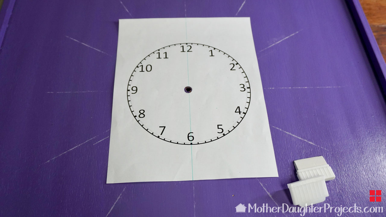 Step 5: Find a clock face graphic on the internet, enlarge, use this to chalk the major lines of the clock face onto the stained wood.