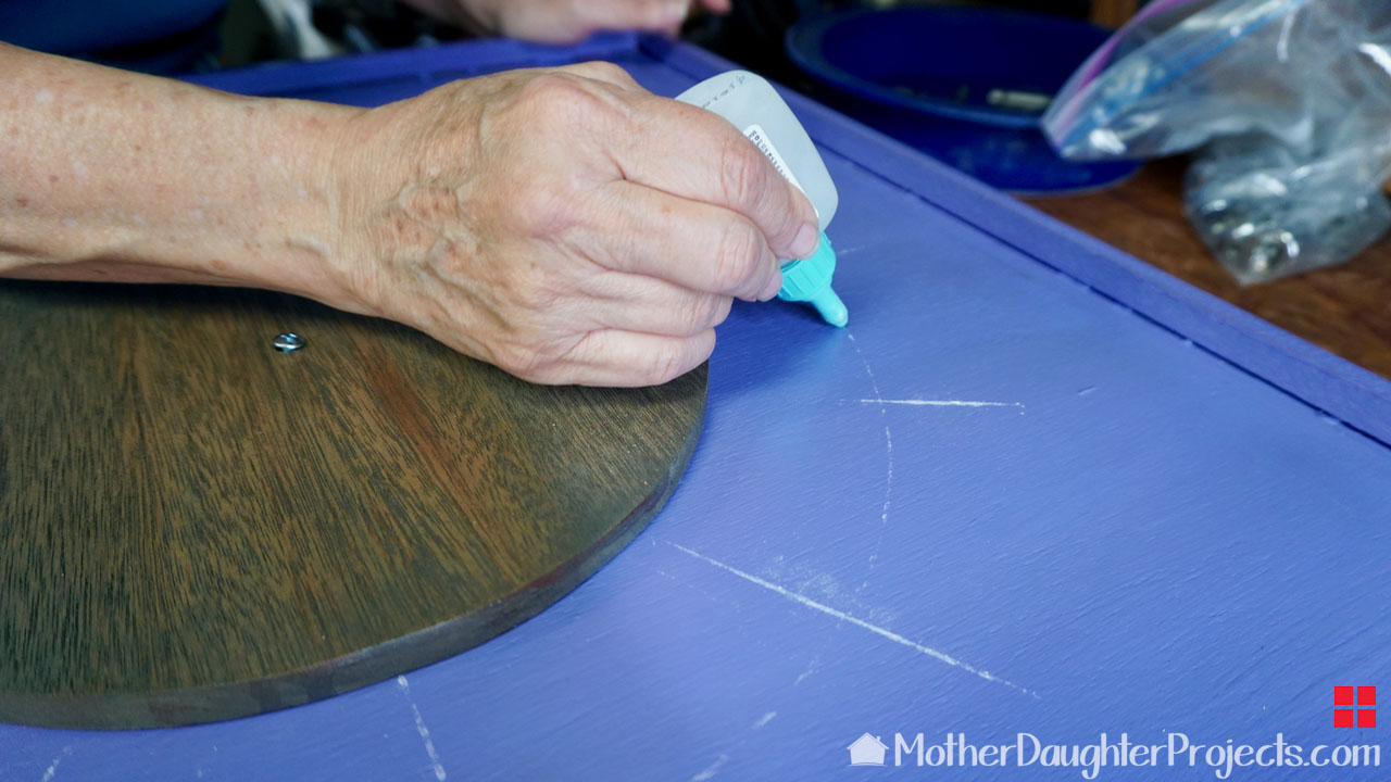 Step 7: Glue the wood trivet piece to the painted bottom part of the drawer.