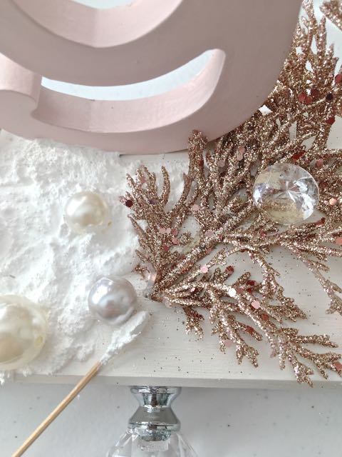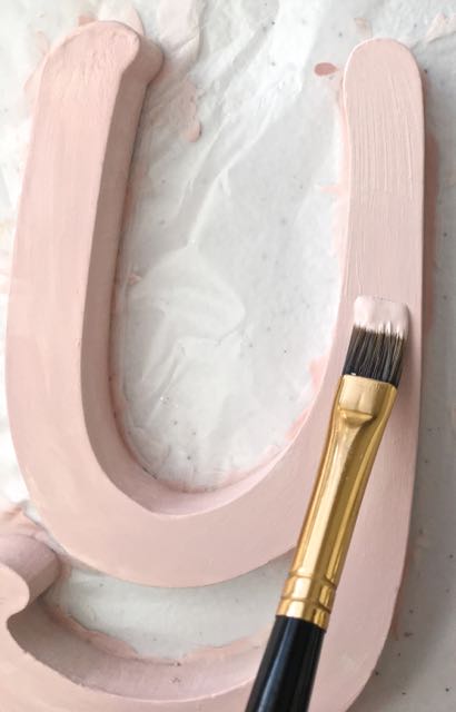 Mix Petal Pink, Snow White and a few drops of Coffee to create a color that matches the pink pearls. With a brush, paint the wood letters.