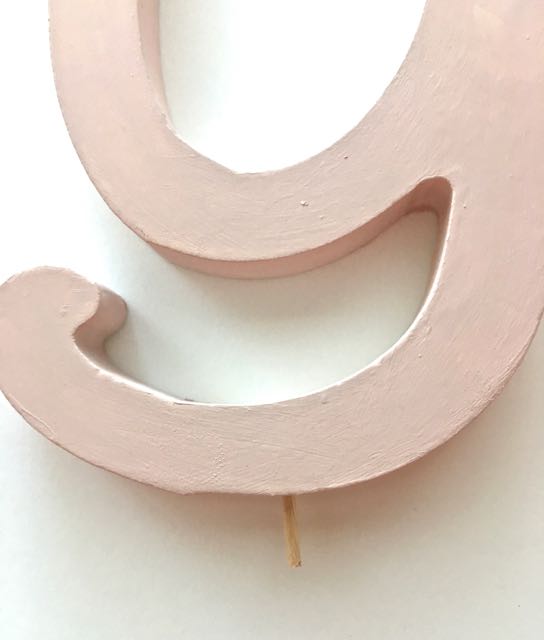 Cut the toothpick to measure 1” long. Cover it in Elmer’s glue. Insert one end into the bottom of the letter and the other end into the wood block. Reinforce the connection with hot glue to the left and right of the center under the curve of the letter.