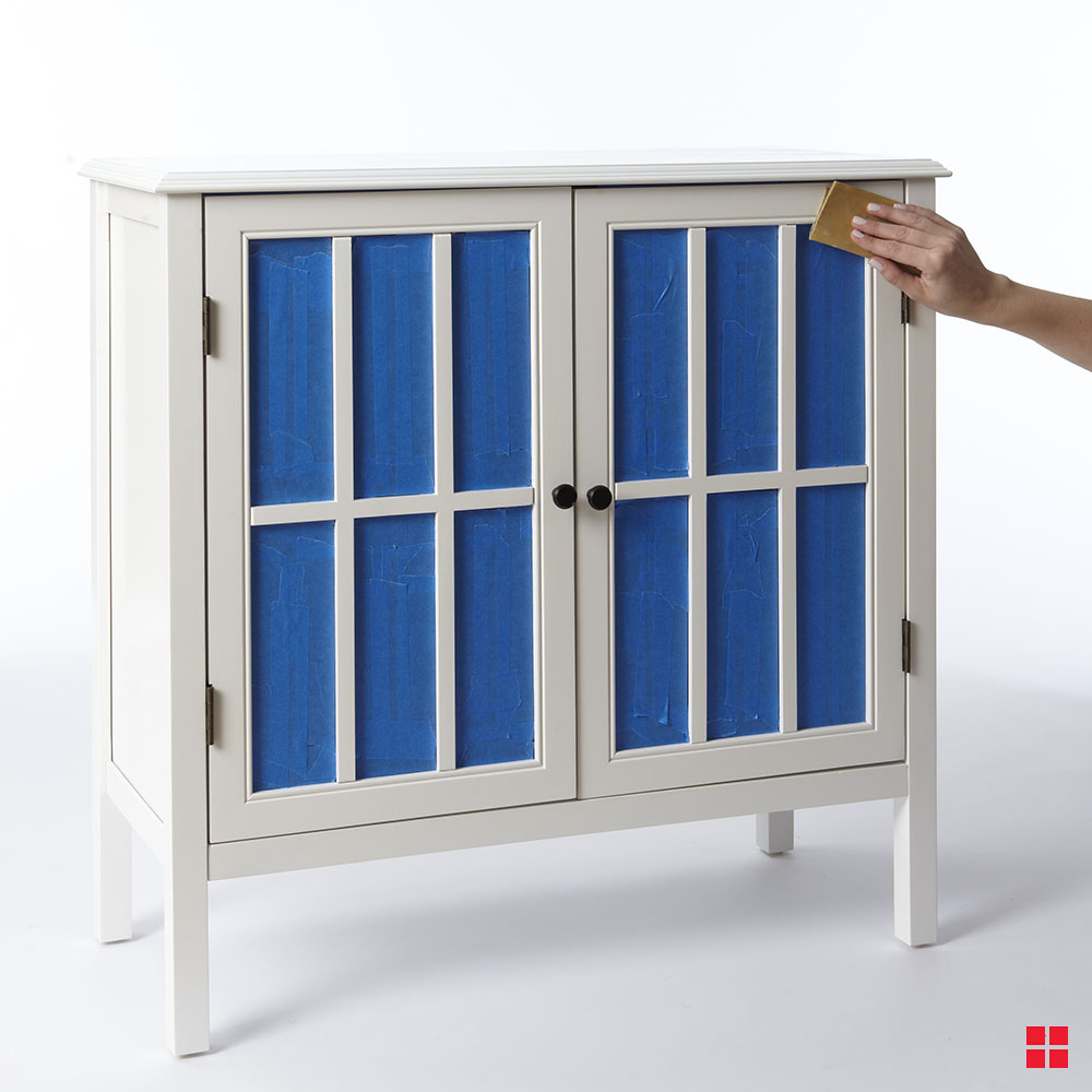 PREPARE: Always work in a well-ventilated area, such as a garage, and cover the floor and surrounding areas with a drop cloth to protect it from overspray. Remove all old hardware from the cabinet, and apply painter's tape to any areas you don't want to paint. Lightly scuff the surface with sandpaper.