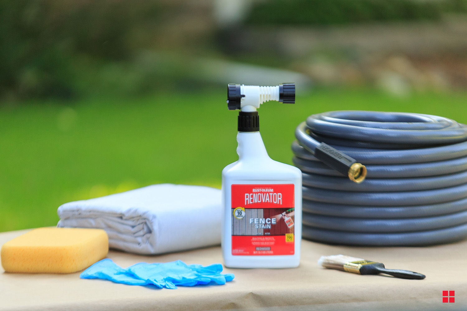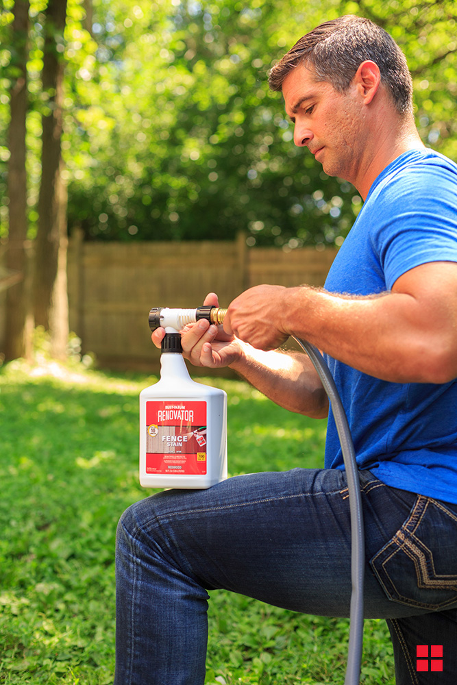 APPLY: Connect the Fence Renovator product to the end of your garden hose. Stand about 2-3 feet away from the fence. Turn the Renovator bottle applicator to the far right position and allow the water and stain to flow freely while moving the bottle up and down, overlapping each stroke for best coverage.