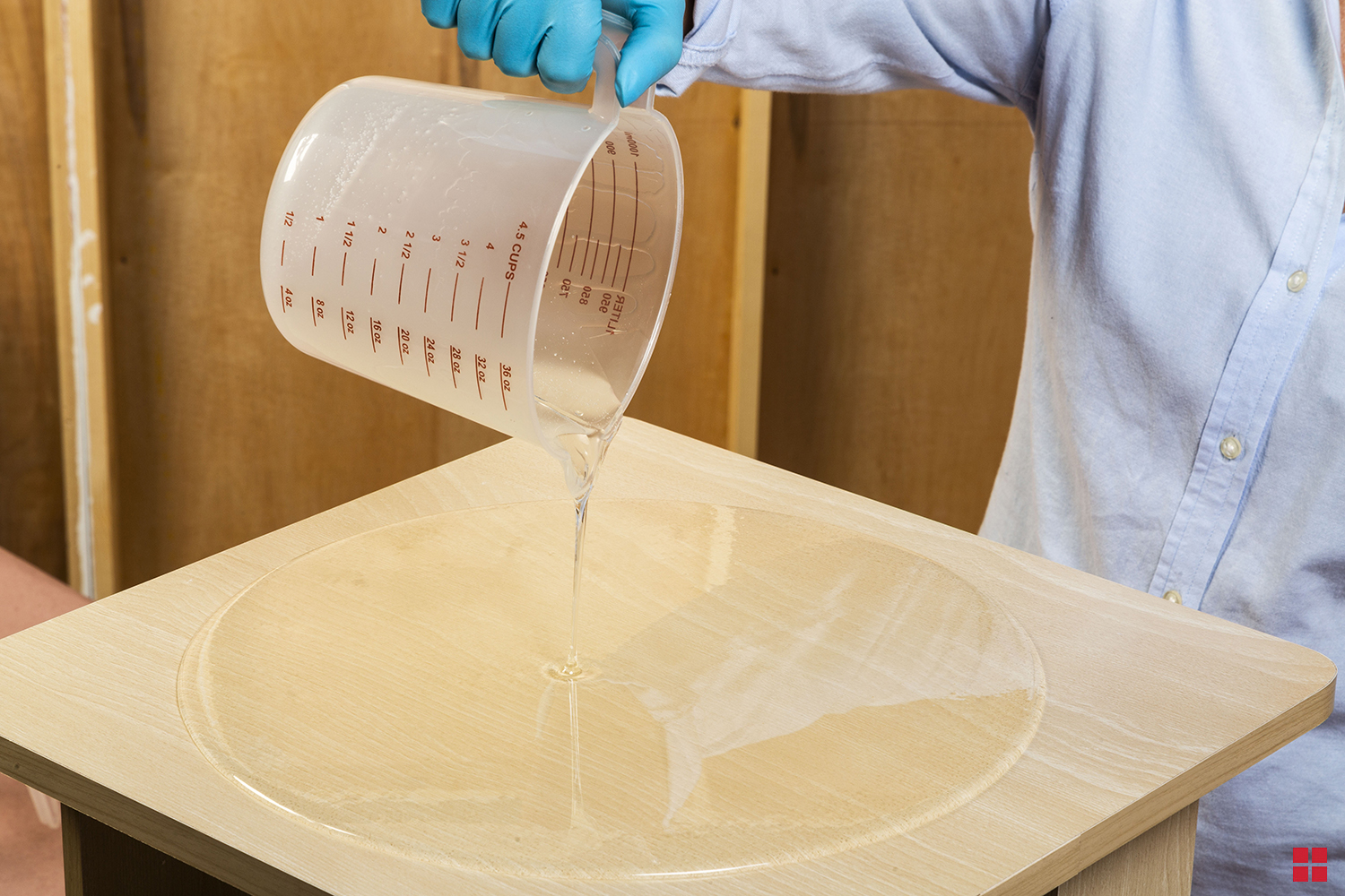 Carefully pour the measured resin (Part A) into the container with measured activator (Part B). Mix thoroughly and gently with a stir stick for a minimum of 3 minutes (no more than 5 minutes). Gentle mixing will minimize air bubbles in the mixture and resulting finish. Be sure to scrape the sides and bottom of the container when mixing.